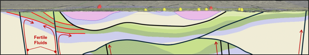 Figure 2: Cross section illustrating interpreted deep crustal plumbing and laterally extensive reduced stratigraphic horizons. Newly identified copper occurrences confirm the fertility of these reduced units. Ongoing work is directed toward delineating their intersections with deep structural corridors, representing high-priority targets within the evolving district-scale mineralizing framework.